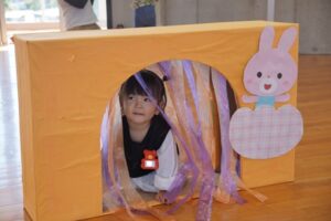 次に出てきたのがルター。つなげて輪にしたベルターの中に入って電車ごっこ。