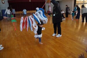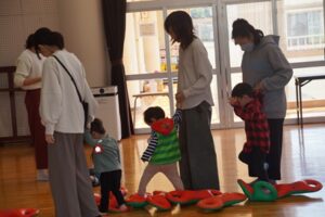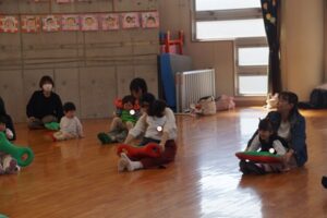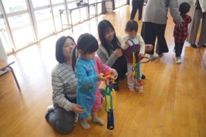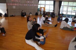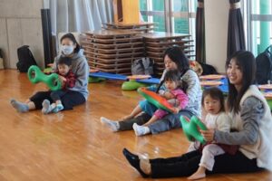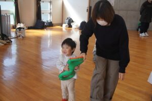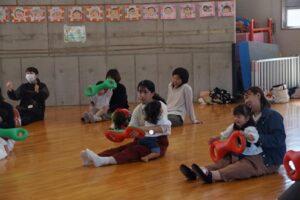最初から、カラフルなベルに興味津々。でも、まずは、親子ふれあい準備体操。