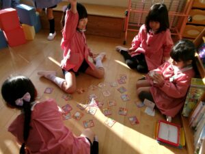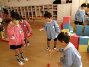 お部屋ではお正月遊び(コマ、けん玉、カルタ)をお友だちと一緒に楽しく遊んでいます😄