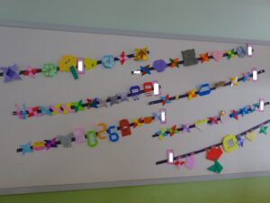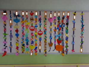 年中組は冬休みの宿題が全員集まり、2階の渡り廊下の壁が綺麗なお正月壁面に大変身⁉️
