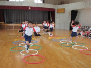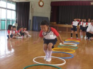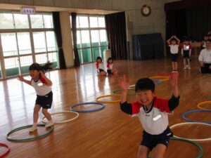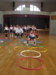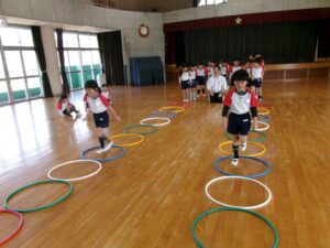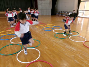 今日の体操教室はフープを使用しました。フープを踏まないように歩いたり、ジャンプをしたりしました。縄跳びの練習をしているからか、両足跳びが軽く、スムーズに進むことが出来ていました☻