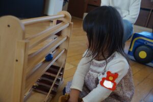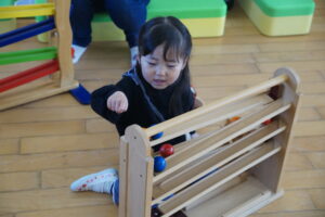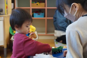 プレぴよルームの好きなおもちゃで少し遊んでお片付け。椅子を持ってきて、さっと座ることができました。
