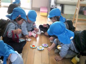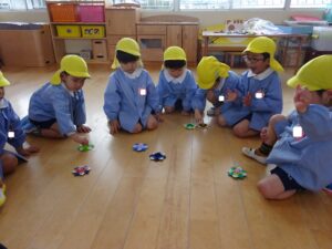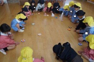早速もらった花ごまを回して遊びました‼️年長組の皆さんありがとうございました✨